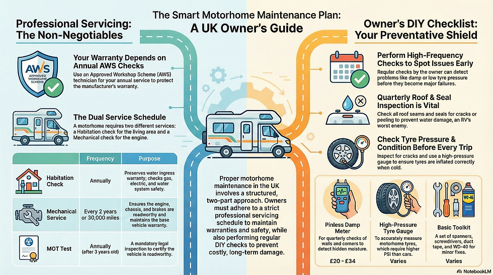 Smart motorhome ownership means knowing precisely what to delegate to certified professionals (warranty-critical checks) and what to master yourself (high-frequency preventative tasks). Knowing these hidden details is what makes DIY a saving, not a liability.